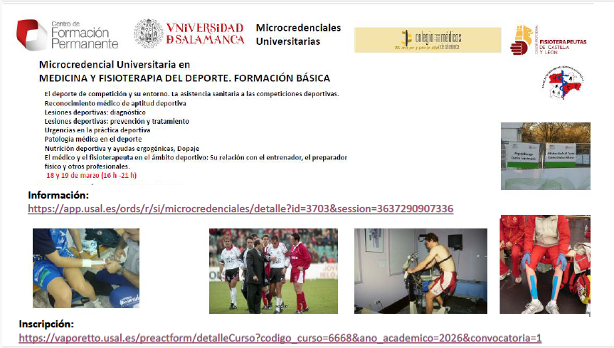 - MICROCREDENCIAL EN MEDICINA Y FISIOTERAPIA DEL DEPORTE. FORMACIÓN BÁSICA. Información. Inscripción